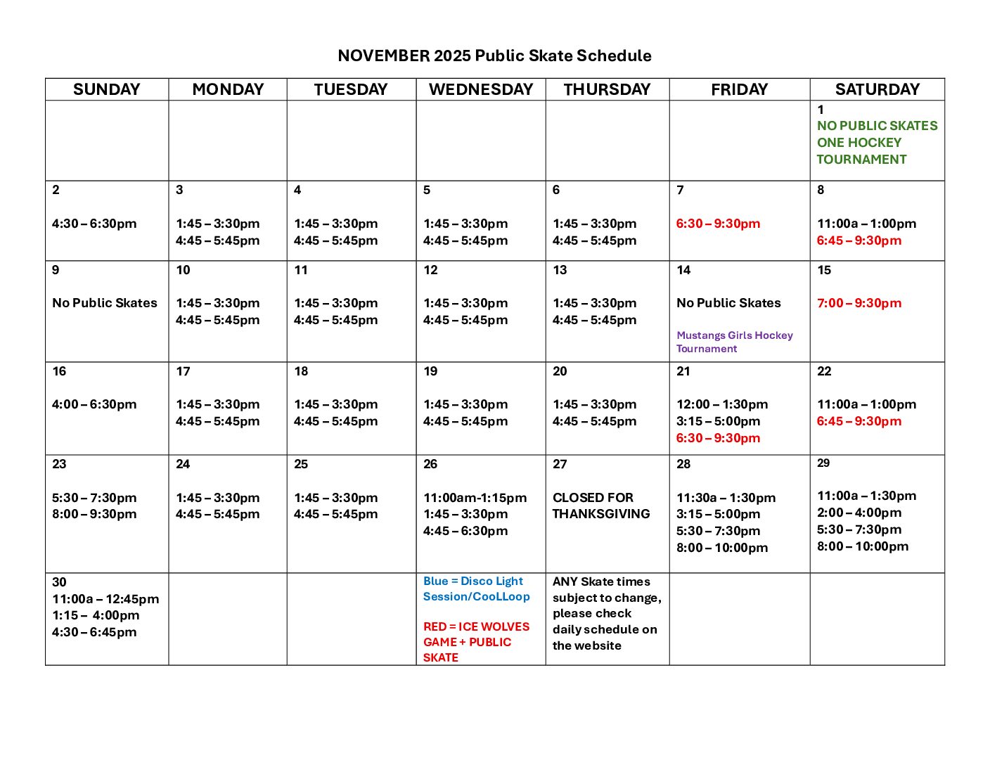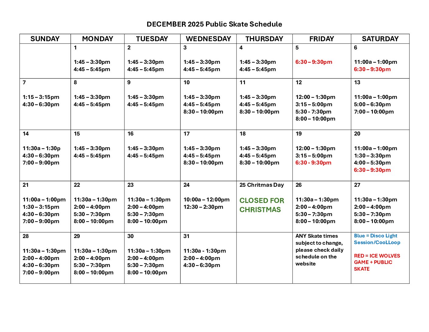 Public Skate Schedule: